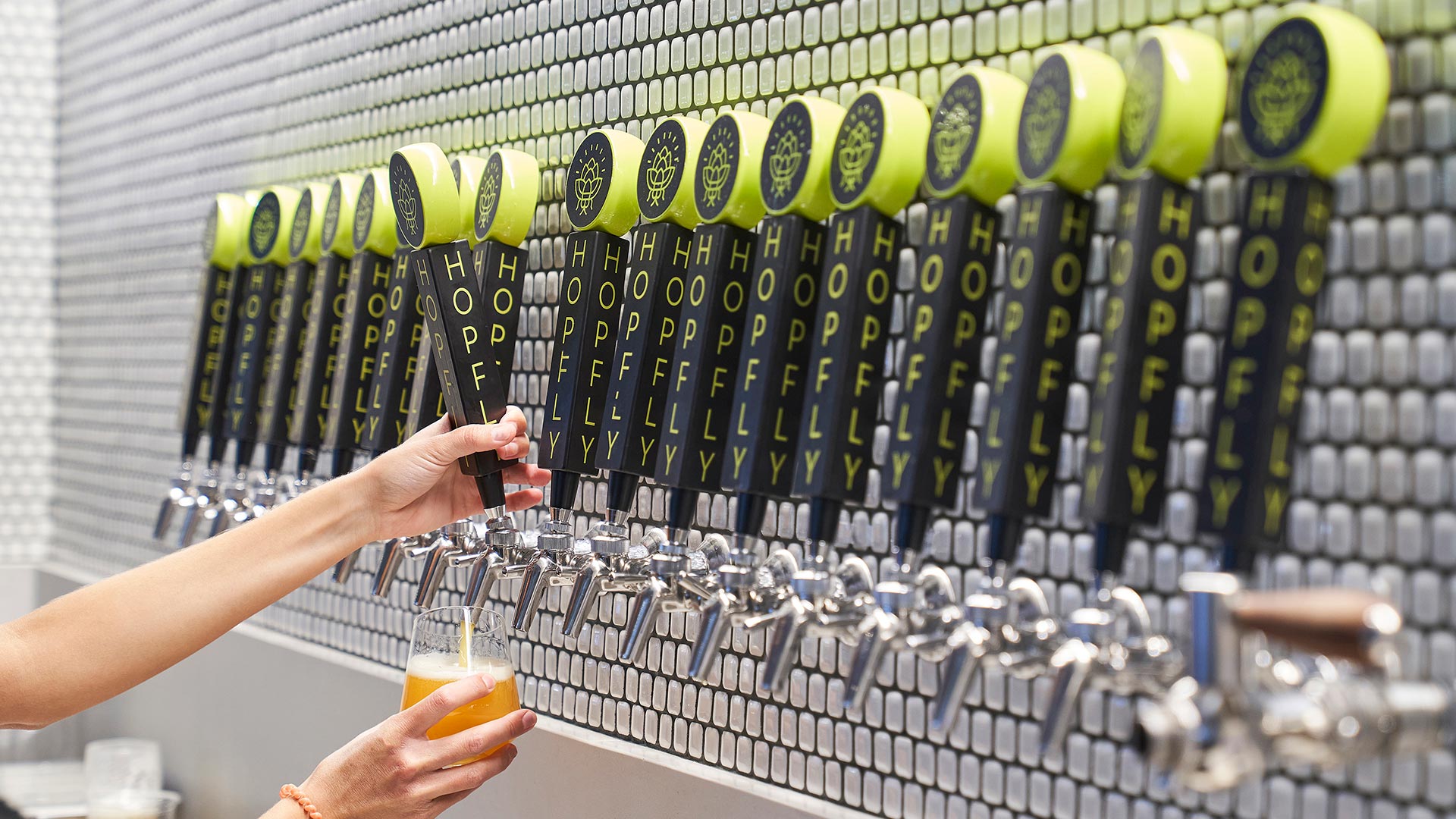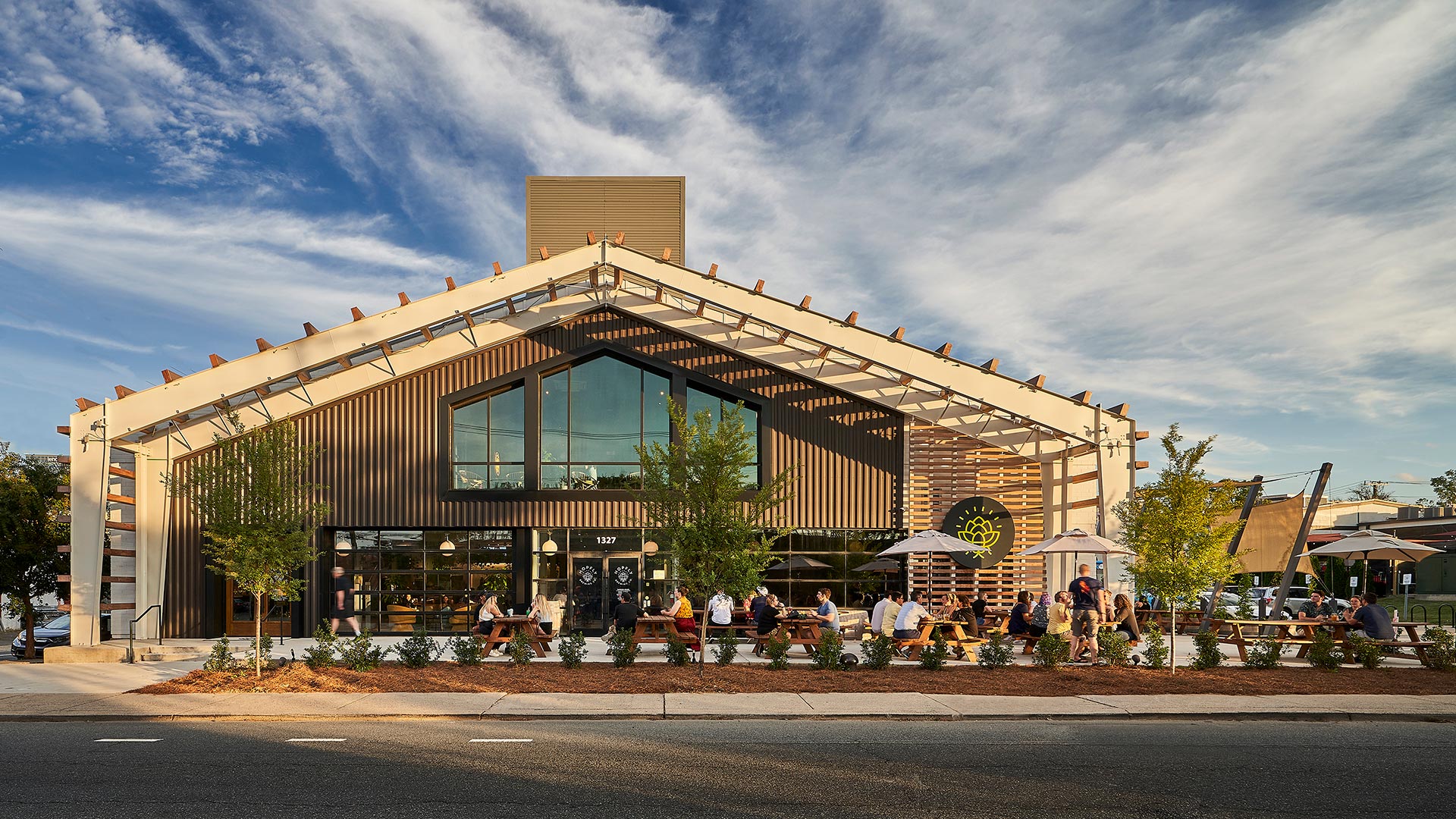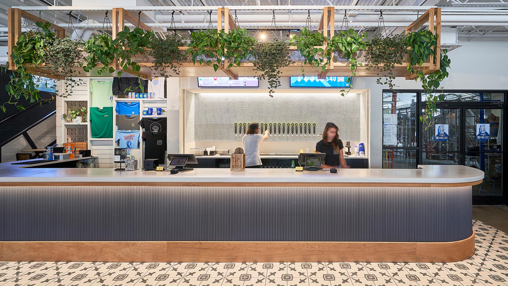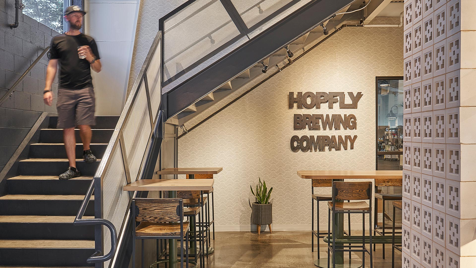 Redline transformed a former brewery into the newly branded HopFly Brewing Co. The renovation included extending the building’s frame to create an inviting “front porch” feel with a steel structure and wood lattice frame. A wood screen wall was added to feature HopFly’s logo. Punching new openings in the building’s once foreboding masonry facade not only softened the architecture, but also allowed natural light to spill into the first and second floor bar areas. The existing bar was removed and new bar was built in the back of the taproom to open up the space and create a move inviting entry experience. New textural finishes and display moments were added throughout the space to showcase Hopfly’s vibrant culture. The existing mezzanine level was fully renovated with new windows, a bar and a mural wall to provide a unique space with a great skyline views.