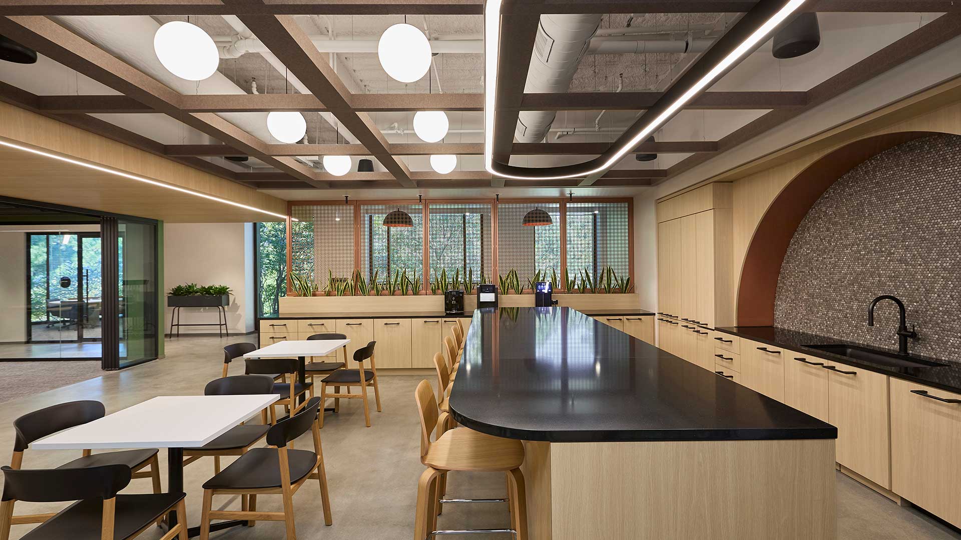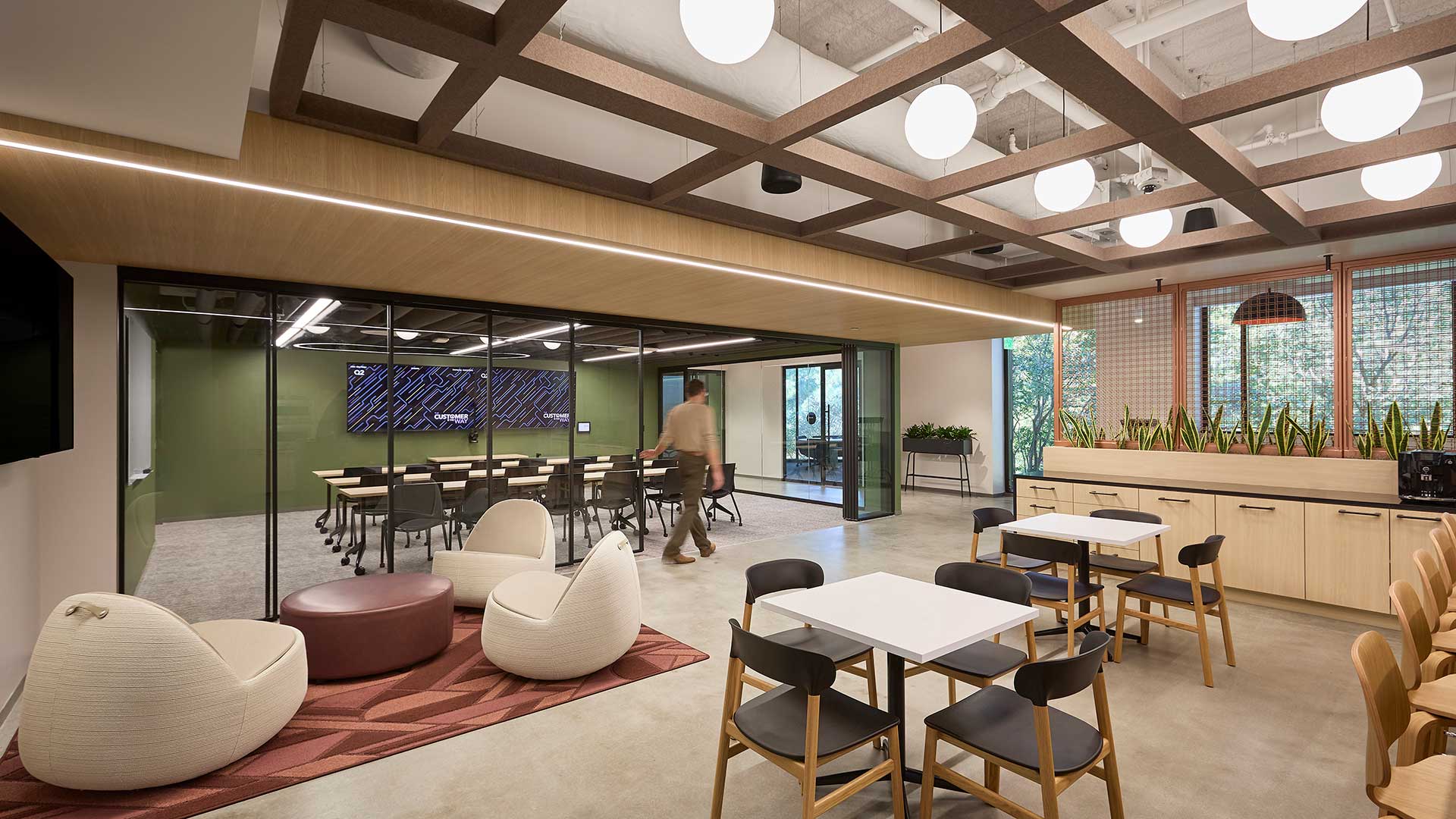 This space draws inspiration from Q2’s digital banking identity, featuring soft curves, natural tones and materials that evoke currency. A key enhancement was the addition of support for a telescoping glass door system that allows the pantry and training room to merge into one flexible event space. Dimmable lighting throughout the space further enhances comfort, allowing users to adjust illumination to their preference.