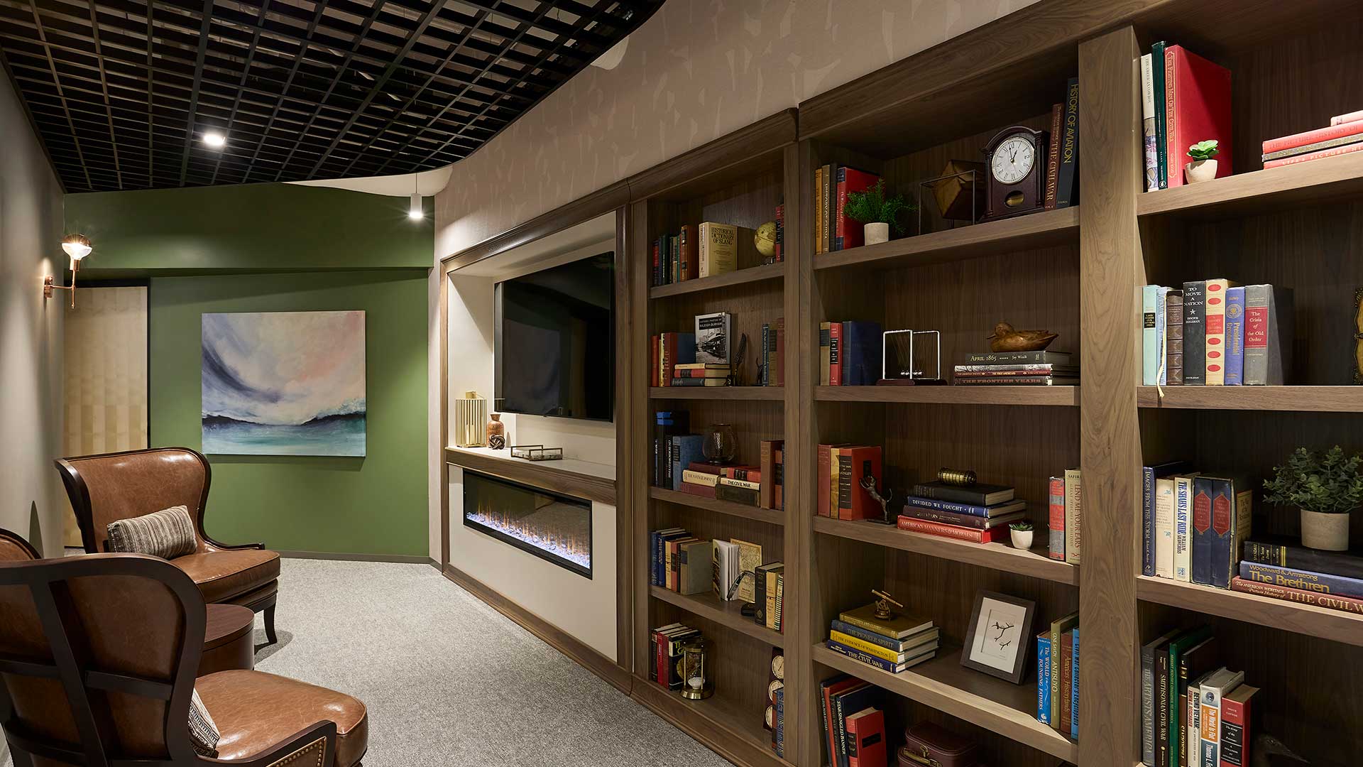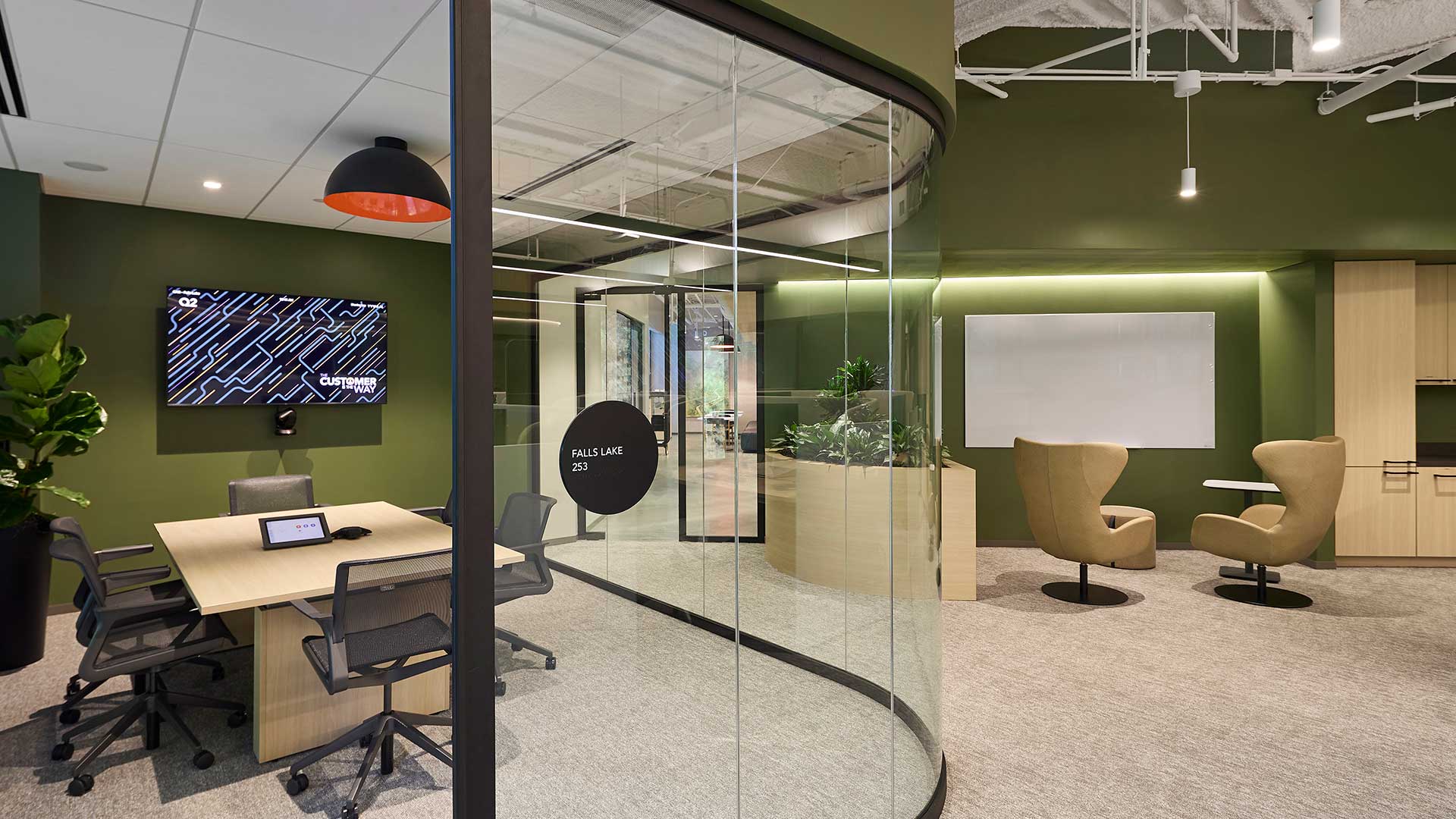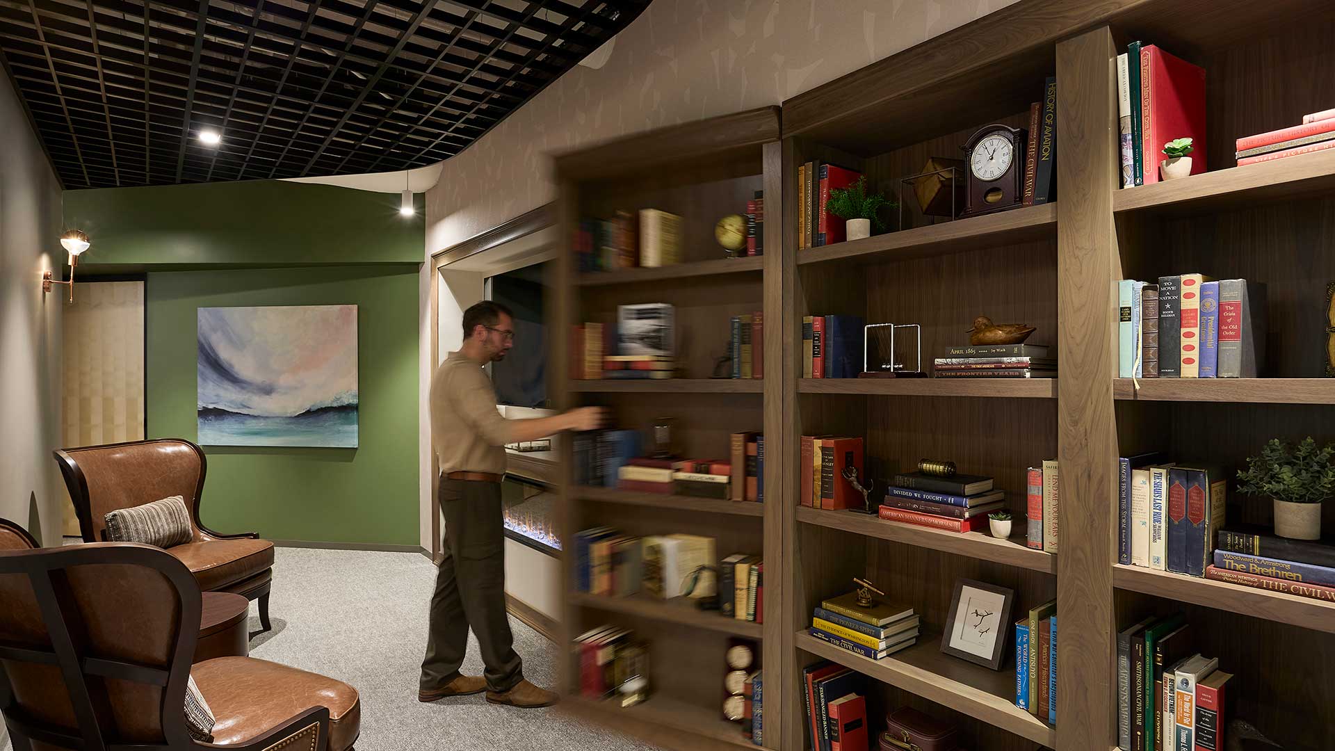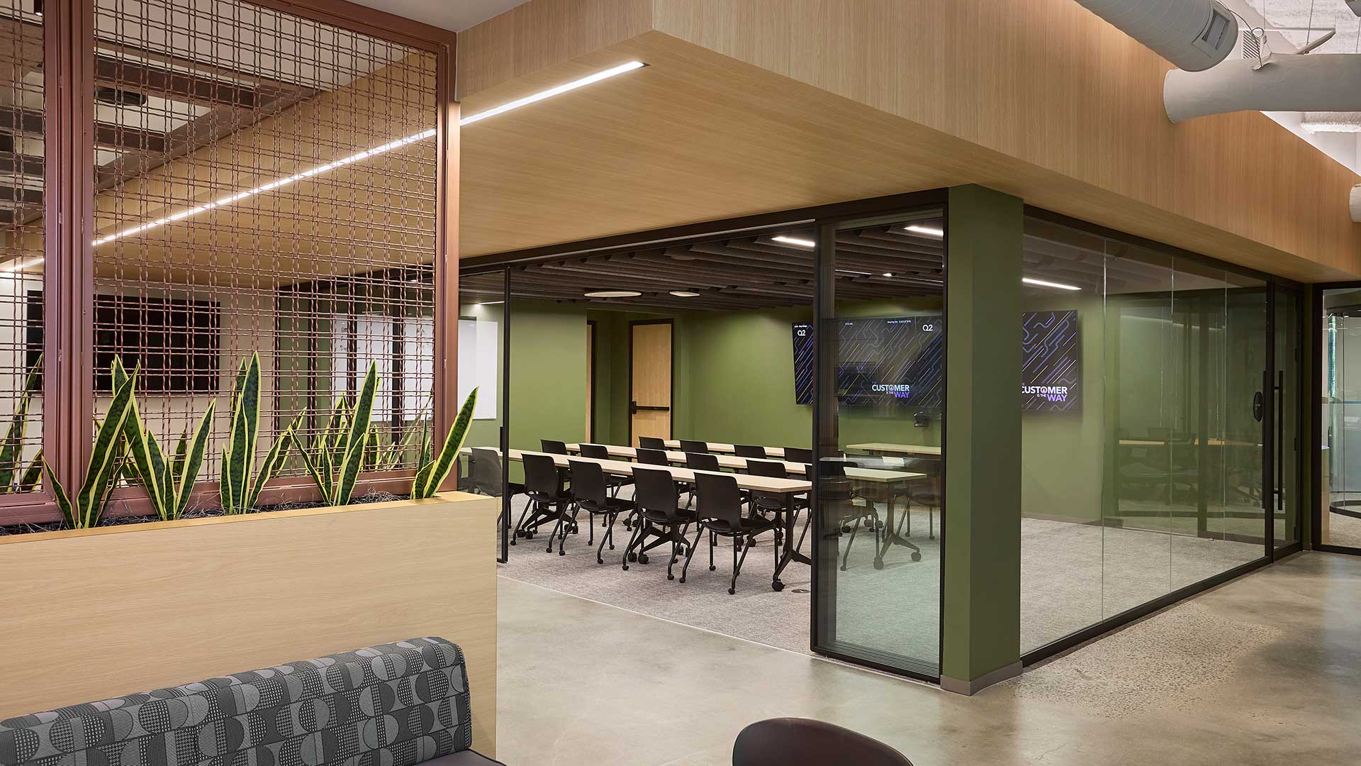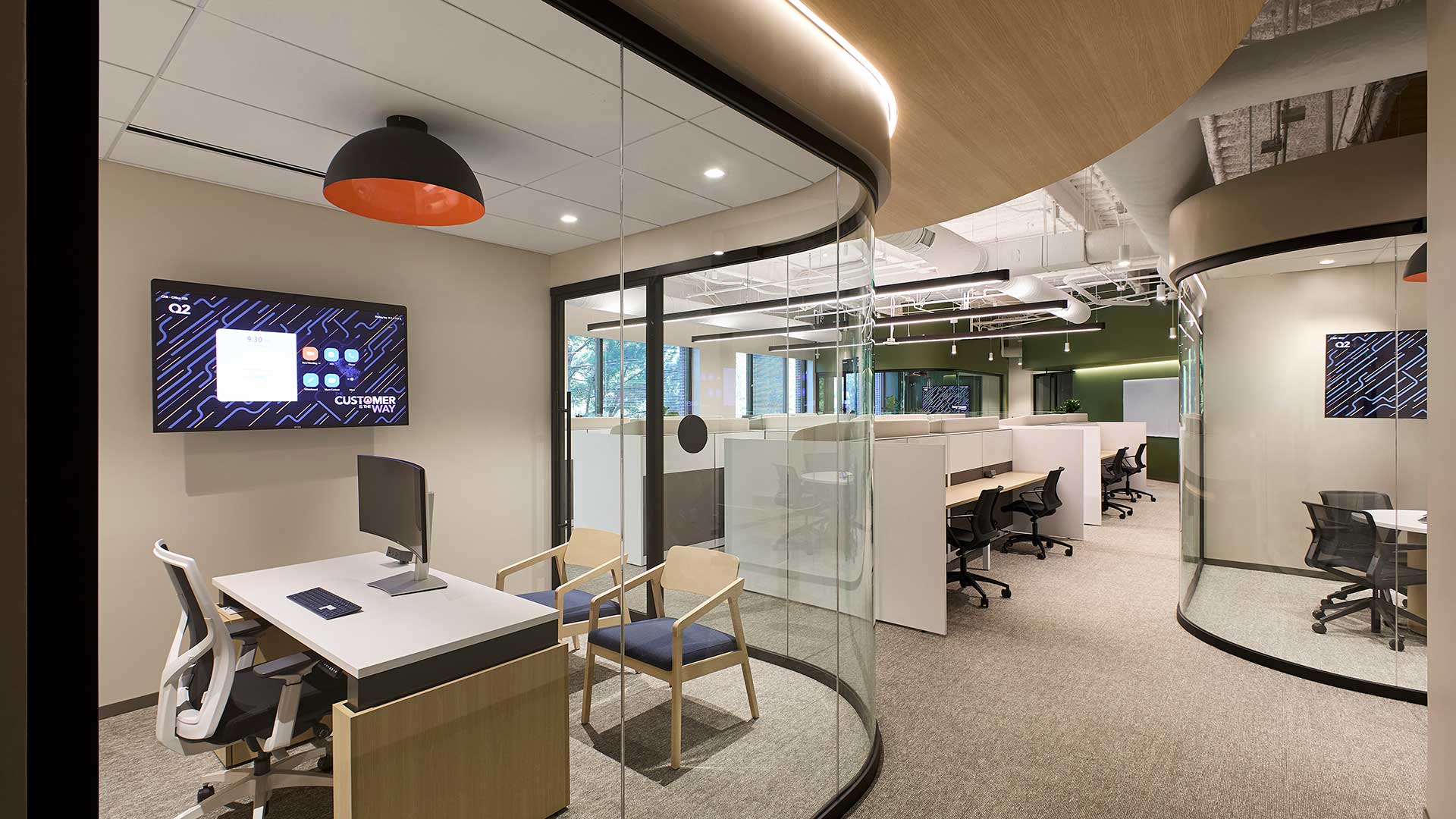 This renovation was designed to support Q2’s evolving hybrid work model while creating an inviting, brand-aligned workspace. The primary goal was to encourage employees to return to the office by crafting a space they love to work in. The design incorporates private workstations alongside meeting rooms, a flexible pantry and a speakeasy lounge accessed through a secret bookshelf door.