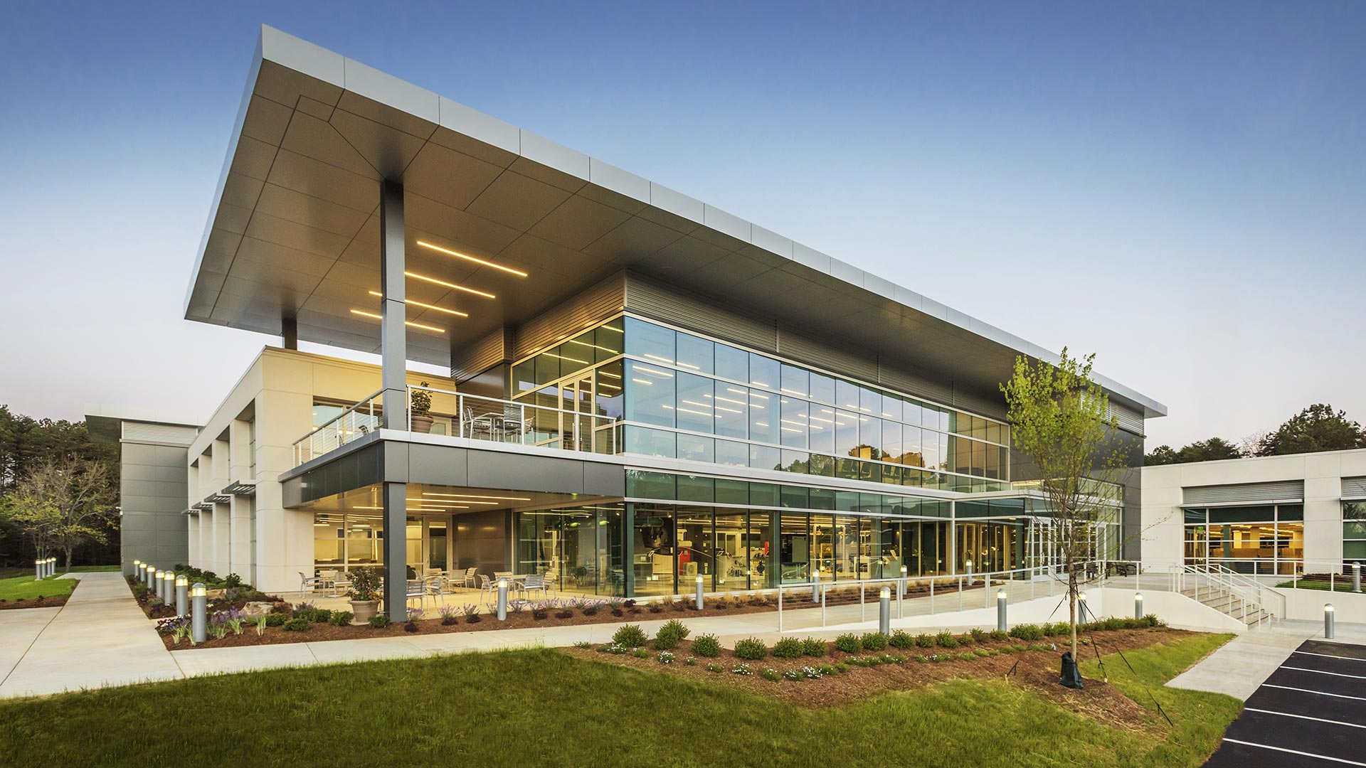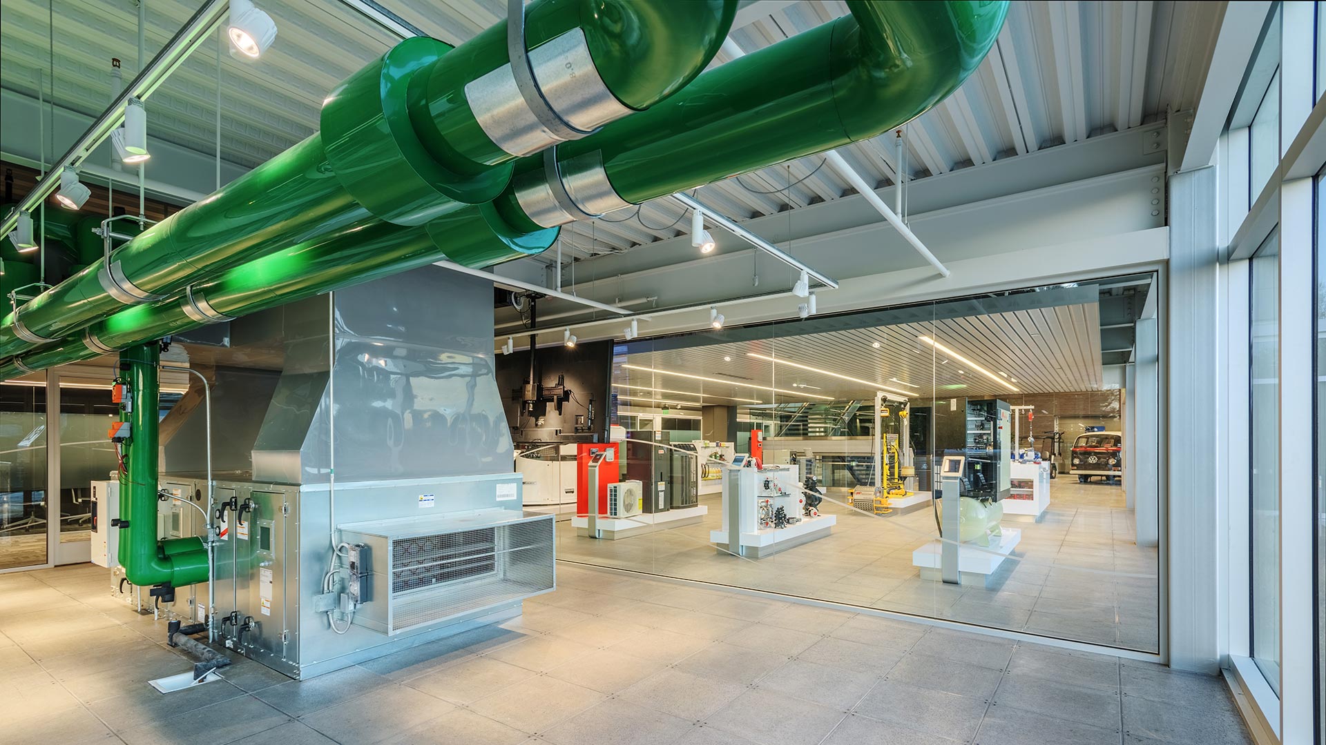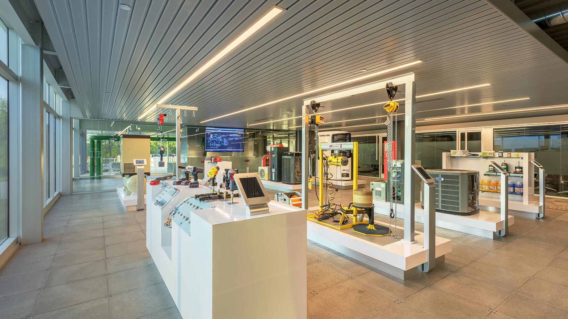 Our design team took a 30 year old, single story building and transformed it into Class A, Sustainability Award-winning, LEED GOLD showcase office building. The goal was to create a denser 2 story building out of 1 floor and give it a new energy efficient skin and mechanical system. Since the Owner was the manufacturer of all of the Trane HVAC equipment to be used, we offered a unique concept of creating a “Living Showcase” to display the equipment. Instead of hiding the chiller and ice-making cooling system like usual, we set it in FRONT of the building. The air handler is set in a glass box at the corner of the building. Adjacent to the air handler, we designed a “Product Showcase” with 9 interactive kiosks that allow visitors to manipulate the full spectrum of products that Ingersoll Rand manufactures.