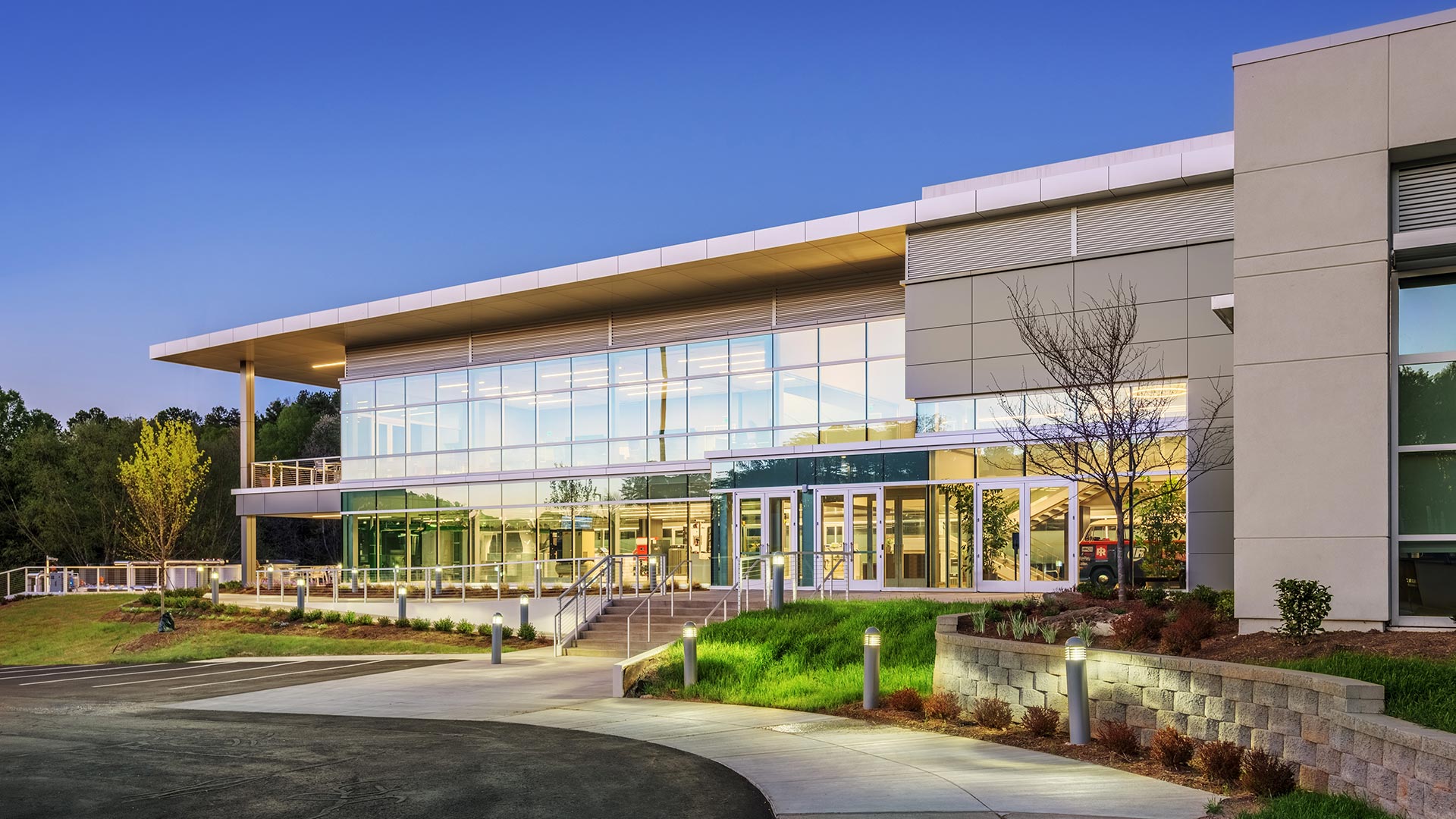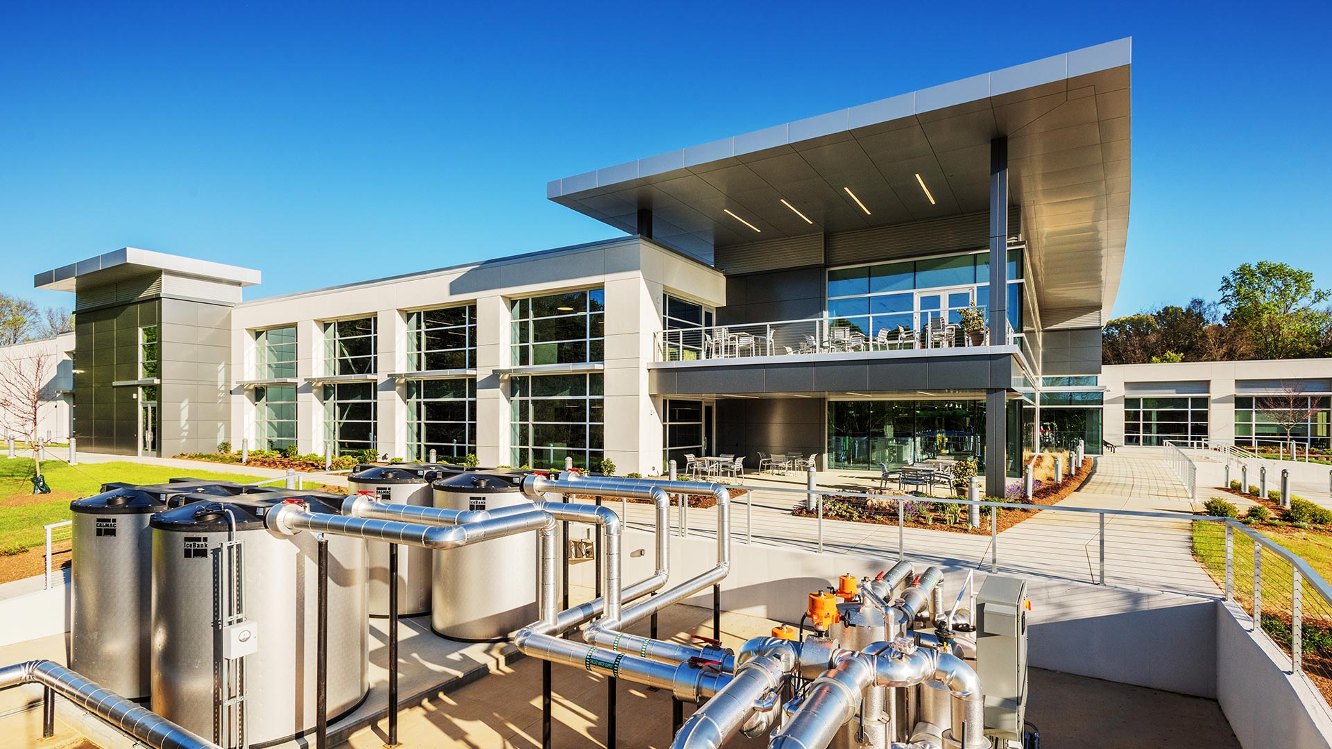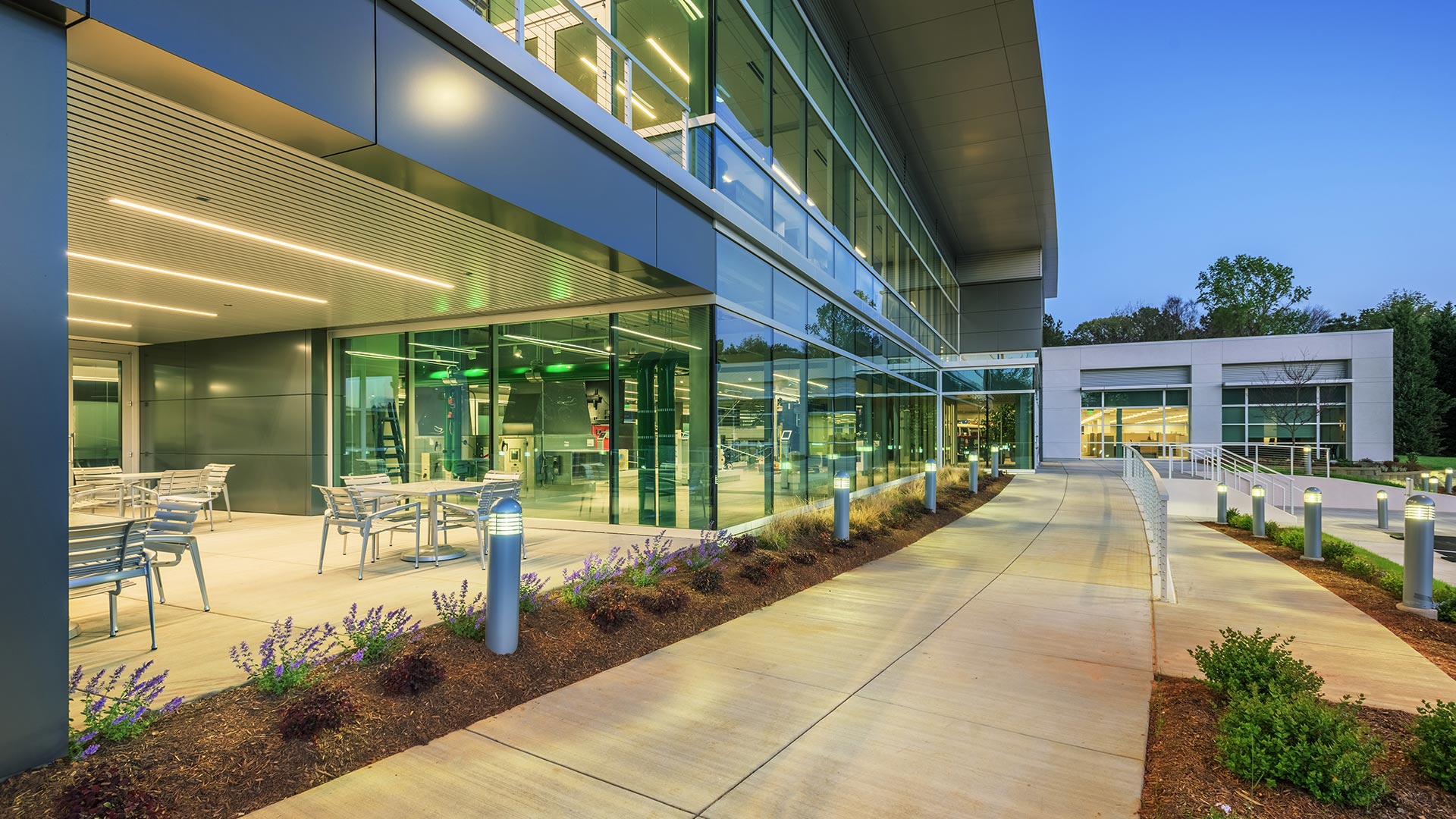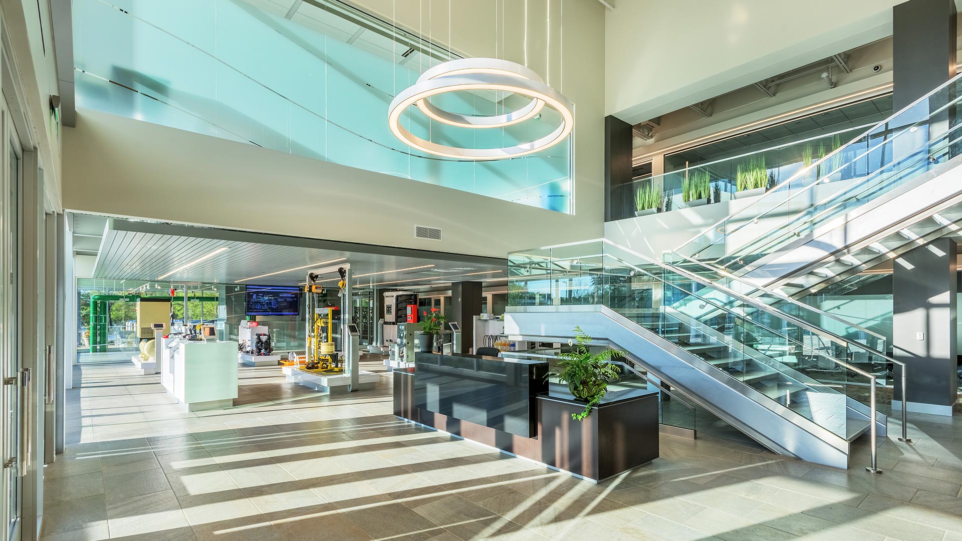 Our design team took a 30 year old, single story building and transformed it into Class A, Sustainability Award-winning, LEED GOLD showcase office building. The goal was to create a denser 2 story building out of 1 floor and give it a new energy efficient skin and mechanical system. Since the Owner was the manufacturer of all of the Trane HVAC equipment to be used, we offered a unique concept of creating a “Living Showcase” to display the equipment. Instead of hiding the chiller and ice-making cooling system like usual, we set it in FRONT of the building. The air handler is set in a glass box at the corner of the building. Adjacent to the air handler, we designed a “Product Showcase” with 9 interactive kiosks that allow visitors to manipulate the full spectrum of products that Ingersoll Rand manufactures.