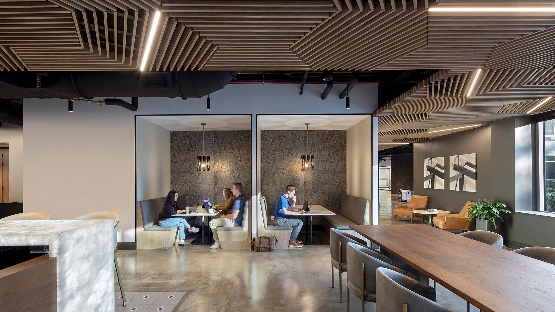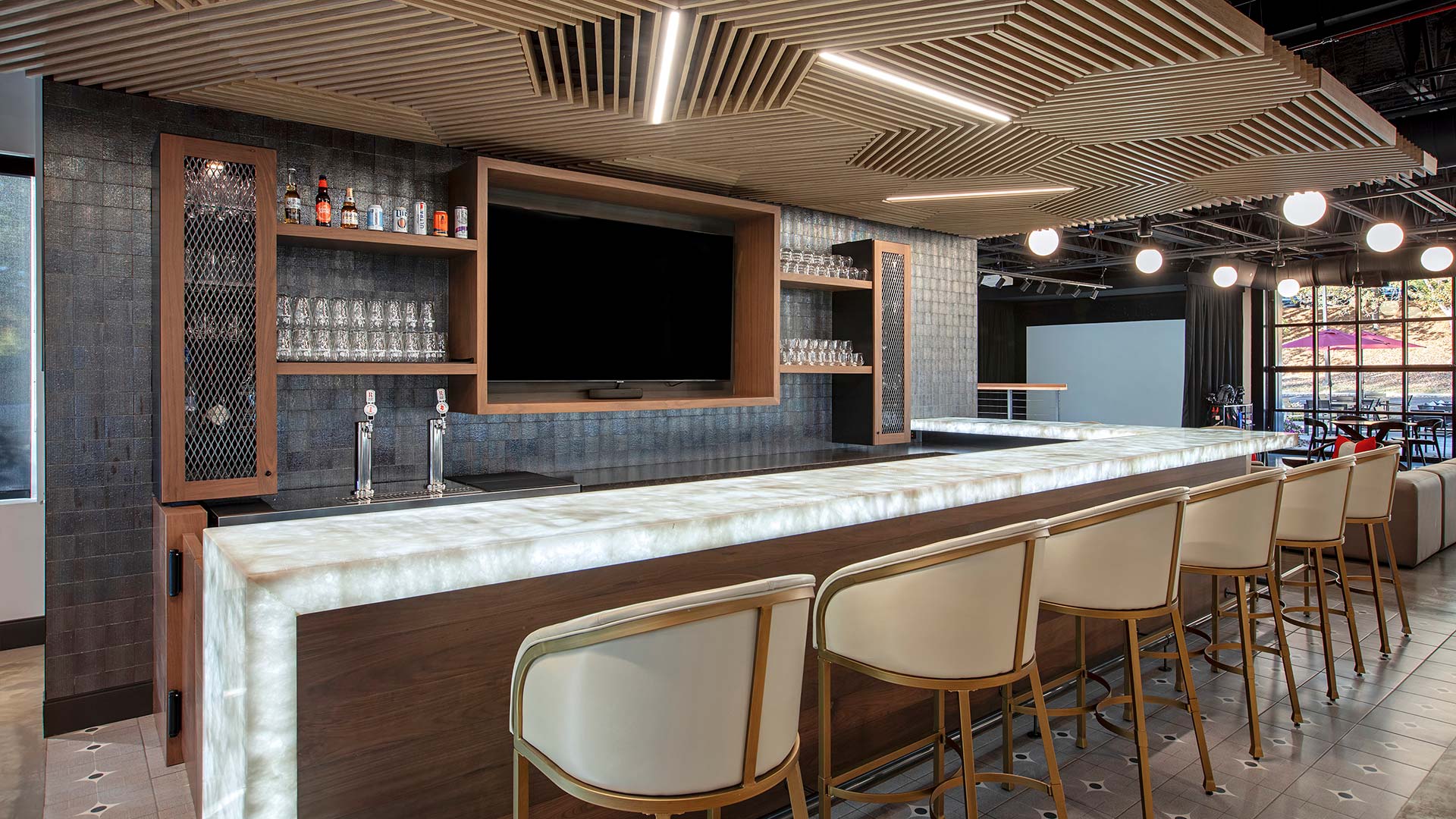 No portion of the building was overlooked, including an elevator shaft relocation, a central atrium (which involved cutting a hole in an elevated slab to create), exterior façade improvements, and a dynamic amenity space complete with a translucent back-lit bar and golf simulator! A custom wood-slotted ceiling with linear lighting in the reception area visually leads the eye through to a large multi-function entertainment area. With a variety of furniture arrangements and settings, the blended space lends itself to support all types of structured or casual interactions. Refined, hospitality-like finishes and textured upholsteries throughout both the office and public spaces create a sophisticated, inviting setting that furthers the approachable culture of Sequence. Expansive glass walls surrounding the manufacturing up/downstream areas, microbiology / analytical labs, and controlled utility areas display the hands-on training that serves as the heartbeat of Sequence!